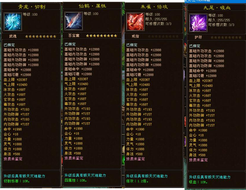 【属 性 丹】:加血上限-气上限-内外攻击防御-四属性,每个丹可吃100层!!