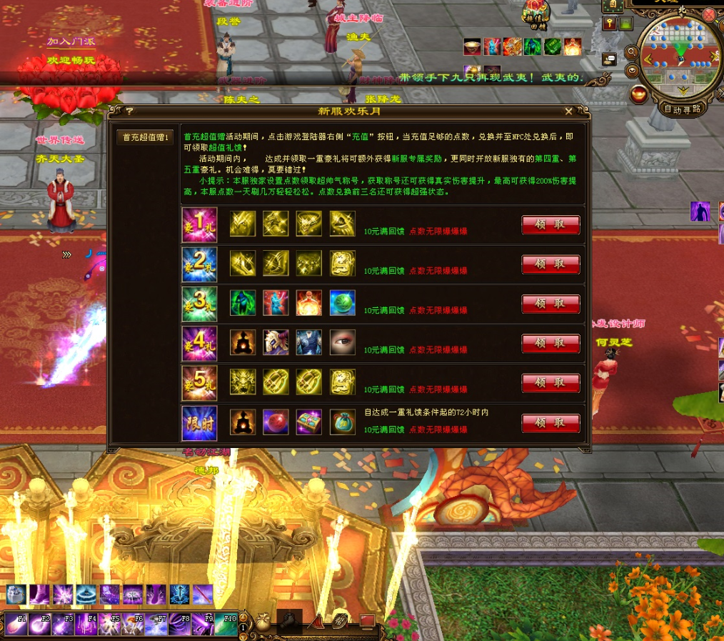 - 【天降财神】:开启时间:20:00-20:30,该地图超过10人无法获得奖励 每分钟都可获得一个:轮回珠礼包