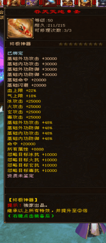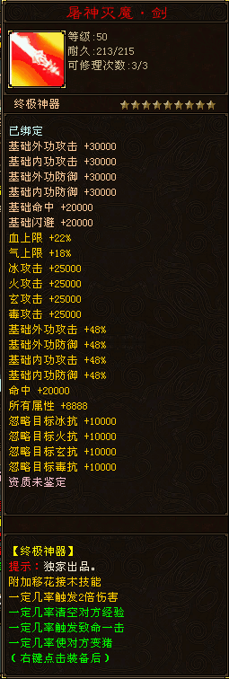 ================================※★※★※★=====★※★※★※============================== 变猪神器:两把屠神灭魔武器:附加移花接木技能、一定几率触发2倍伤害、一定几率清空对方经验、一定几率触发致命一击、一定几率使对方变猪可领取1000W血气攻防 ================================※★※★※★=====★※★※★※============================== 圣兽山宝箱:轮回球大礼包(1000个)非会员必争,100%必出.每2小时刷新一次 兽台争霸宝箱:土豪武器争霸赛场:每天晚上8:15-23:30,每15分钟刷新一个轮回宝箱,打开必得超级轮回球礼盒(500个) 属性称号1-10级:增加人物属性攻击1-10万,攻击200万-2000万,血气上限200万-2000万。 穿刺神器:增加人物内外攻击50万。 土豪神器:增加人物内外攻击200万,附带移花接木效果。 活力状态:可领取300万-2000万血气功防 灭世神器:增加人物内外攻击500万,附带移花接木效果(效果更强伤害更高),几率反伤10万伤害,几率触发经验清零。 [真元橙冰符·八级]:增加人物冰攻击8000,冰抗2600,气血攻防2000万 会员时装:附带流星赶月,并增加100万气血攻防。 VIP令牌:每天可领取10万元宝,1000万增点,紫薇灵魄100个 魔神·靴:战斗中几率放大目标伤害。 超级兔耳朵:战斗中几率触发免疫部分控制技能。 至尊VIP令牌:每天可领取10万元宝,1000万增点,紫薇灵魄100个,超级轮回球500个 至尊VIP碎片:集齐一定数量,可将VIP令牌进阶为至尊VIP令牌,可领取至尊VIP状态 ================================※★※★※★=====★※★※★※============================== ※※※※※ ★★★高级地图★★★ ※※※※※ 寒冰海域:赠点票、至尊强化、紫微灵魄、轮回球、神兽之泪、神器·碎片、魔神·鞋碎片、上古神书残页、灭世の套装(刷新时间系统提示) 灭世火窋:赠点票、至尊强化、紫微灵魄、轮回球、神兽之泪、神器·碎片、魔神·鞋碎片、上古神书残页、灭世の套装(刷新时间系统提示) 蛊惑灵谷:赠点票、至尊强化、紫微灵魄、轮回球、神兽之泪、神器·碎片、魔神·鞋碎片、上古神书残页、灭世の套装(刷新时间系统提示) 秦始皇陵:神秘宝箱、灭世の套装、兔耳朵、100万增点票、5万元宝票、紫微灵魄、轮回球、神器·碎片、魔神·鞋碎片(神秘宝箱专属地图) 藏 经 阁:轮回球礼包、灭世の套装、兔耳朵、100万增点票、5万元宝票、紫微灵魄、轮回球、神兽之泪、神器·碎片、魔神·鞋碎片(轮回球礼包专属地 图) 兽台争霸:土豪神器、灭世の套装、兔耳朵、100万增点票、5万元宝票、神兽大礼包、会员时装坐骑、紫微灵魄、轮回球、(土豪神器专属地图) 寒 玉 谷:使用稀世珍宝图召唤终极BOSS,掉落土豪神器,王权进阶宝石碎片,属性称号材料,轮回球,紫薇灵魄、赠点票(属性称号专属地图) 束河古镇:会员冥石、紫微小礼包、轮回球小礼包、土豪武器进阶符、天道神石进阶符、神秘宝箱,火云邪神必爆超级轮回球(超级轮回球专属地图) 亮 马 驿:紫微灵魄礼包、100万增点票、5万元宝票、至尊强化、紫微灵魄、轮回球、神器·碎片、魔神·鞋碎片、上古神书残页、灭世の套装(紫微灵魄 礼包专属地图) 大理旷世神龟:战神石头、灭世の套装、穿刺神器、100万增点票、至尊强化、紫微灵魄、轮回球、神兽之泪、神器·碎片、魔神·鞋碎片、上古神书残页( 战神宝石专属地图) 苏州旷世神龟:战神石头、灭世の套装、穿刺神器、100万增点票、至尊强化、紫微灵魄、轮回球、神兽之泪、神器·碎片、魔神·鞋碎片、上古神书残页( 战神宝石专属地图) 圣兽山旷世神龟:战神石头、灭世の套装、穿刺神器、100万增点票、至尊强化、紫微灵魄、轮回球、神兽之泪、神器·碎片、魔神·鞋碎片、上古神书残页 (战神宝石专属地图) 争霸赛场:3000万增点票、5万元宝票、神兽大礼包、会员时装坐骑、紫微灵魄、轮回球、土豪神器、灭世の套装、兔耳朵、王权进阶宝石(王权宝石专属地 图) 仙兽坛:王权宝石、天道神石、轮回小礼包、超级轮回小礼包、紫微灵魄小礼包等珍稀物品 争霸赛场魂天帝:BOSS 掉落满地包裹,可开启超级轮回球、紫薇灵魄、至尊VIP碎片 竞技场:100%掉落至尊VIP碎片,集齐一定数量兑换可至尊VIP令牌,至尊VIP令牌可领取500万攻血防。(至尊VIP令牌专属地图) ※※※※※ ★★★属于下列情况的人请自觉绕道★★★ ※※※※※ 1进游戏前请关闭任何的杀毒软件 2保证客户端之前没有解压过任何其他私服 3保证官方客户端是官方最新的 并且试试官方是否能运行正常 4合区注意:请玩多区的玩家不要用同一角色名字和同一账号,建角色的时候取角色名尽量复杂(保持唯一) 5角色清理:为减少服务器垃圾数据承载量,老区服务器合区前会清理30天没上过线的号,以及100级以下账号,请玩家注意! 6我们将努力的更新……只有你们的支持,才是我们最大的动力!!!!这里一定将会是您永远的游戏天堂。